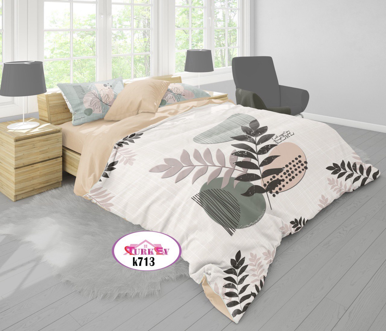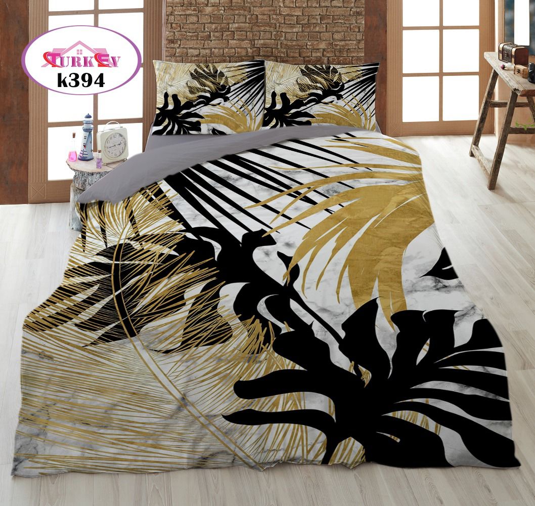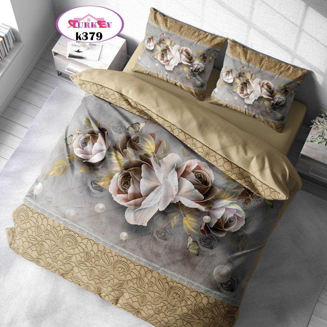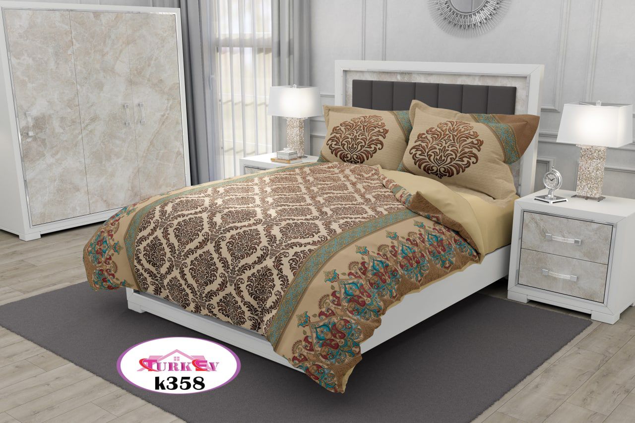 4 تکه شامل: 1 عدد ملحفه تک رنگ، 1 جفت روبالشی پاکتی چاپی، 1 جفت روبالشی پاکتی تک رنگ، لحاف روتختی چرخکاری شده