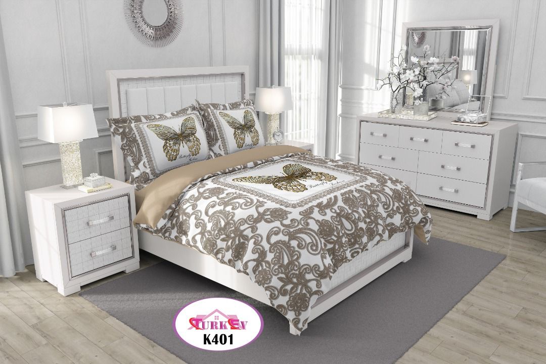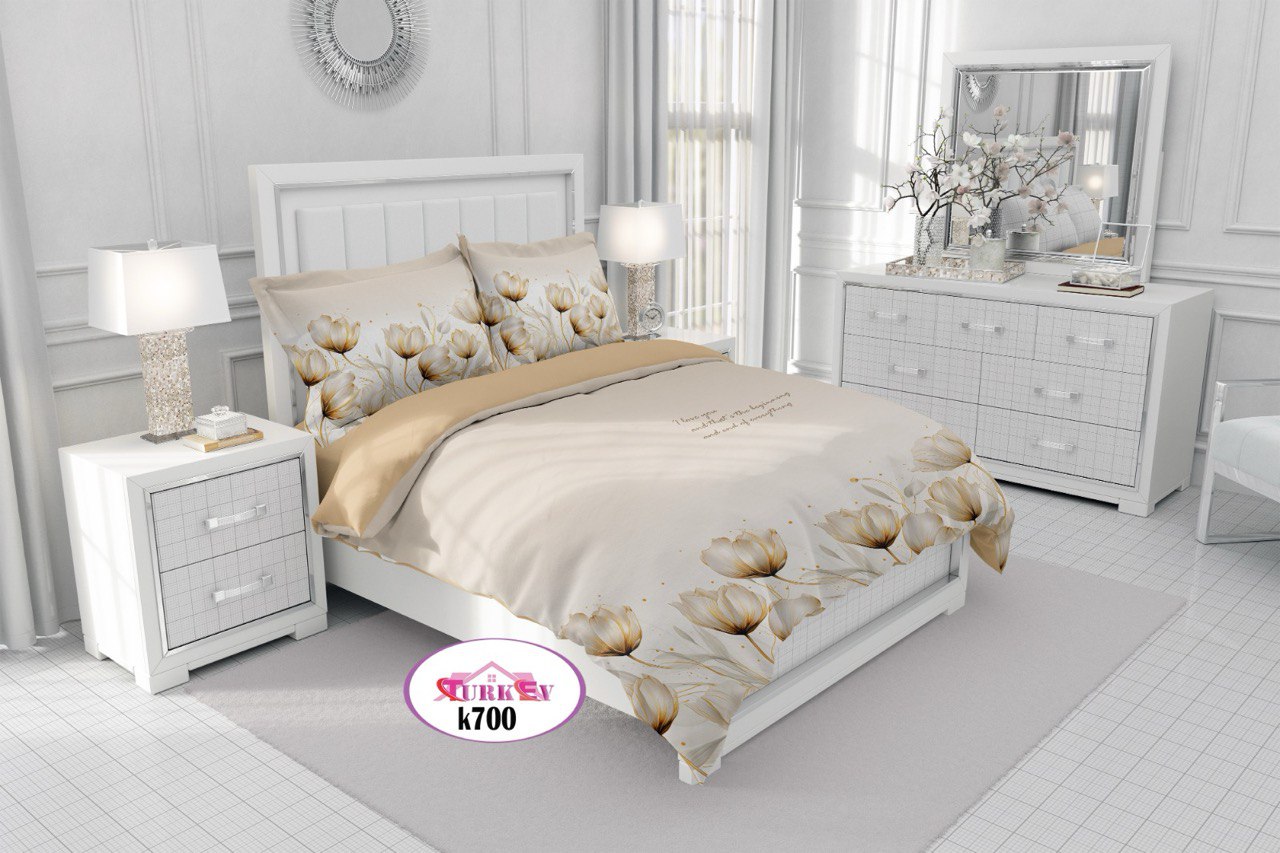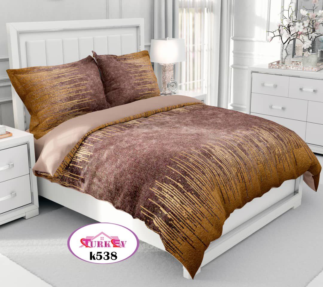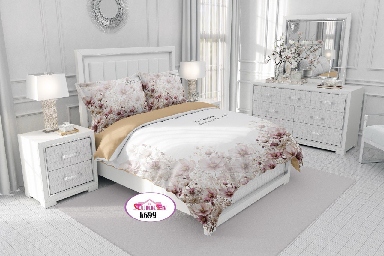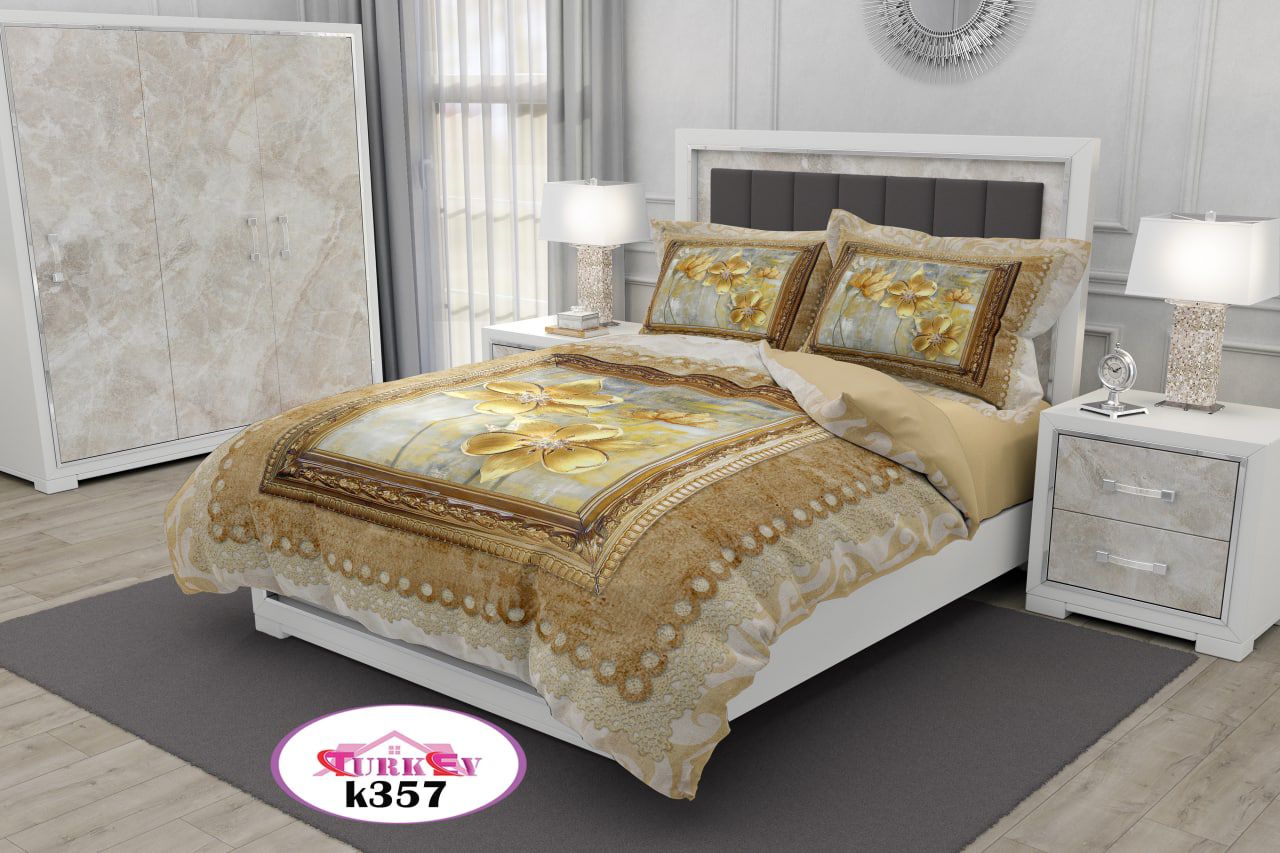 4 تکه شامل: 1 عدد ملحفه تک رنگ، 1 جفت روبالشی پاکتی چاپی، 1 جفت روبالشی پاکتی تک رنگ، لحاف روتختی چرخکاری شده