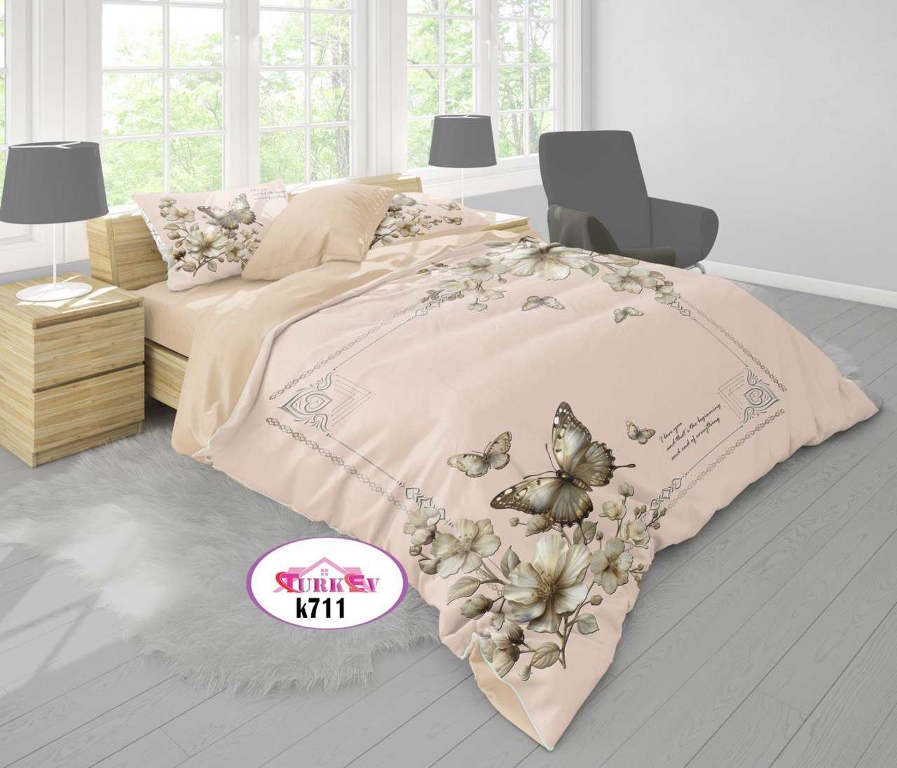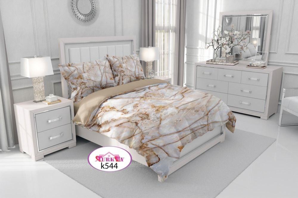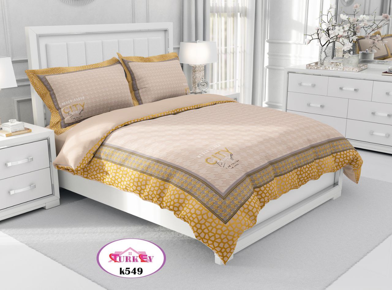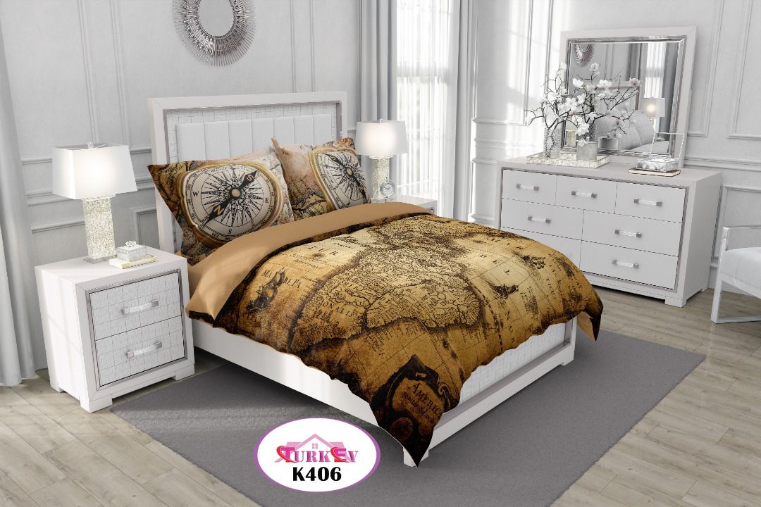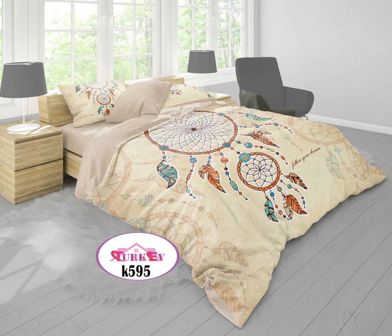 4 تکه شامل: 1 عدد ملحفه تک رنگ، 1 جفت روبالشی پاکتی چاپی، 1 جفت روبالشی پاکتی تک رنگ، لحاف روتختی چرخکاری شده