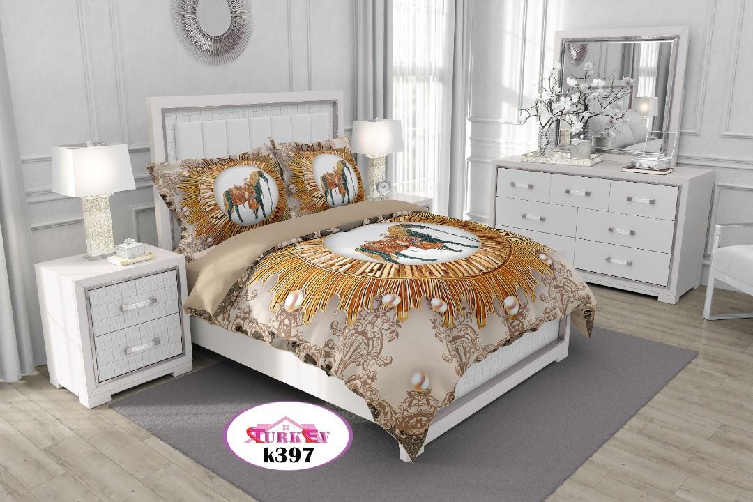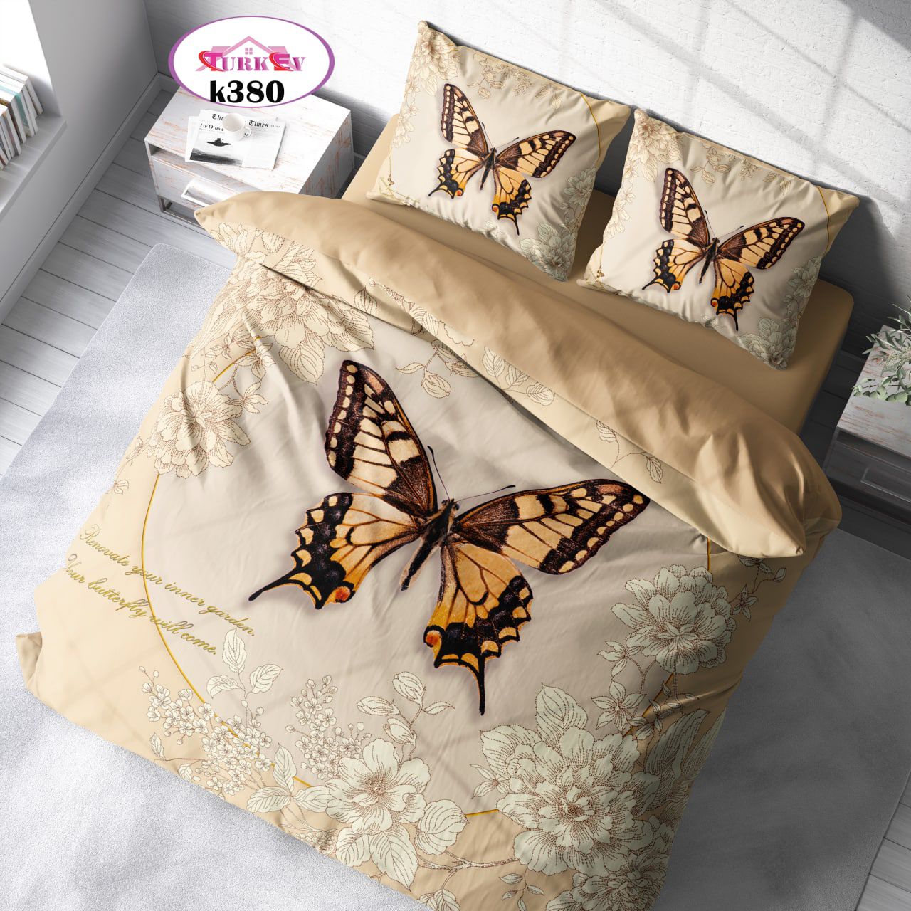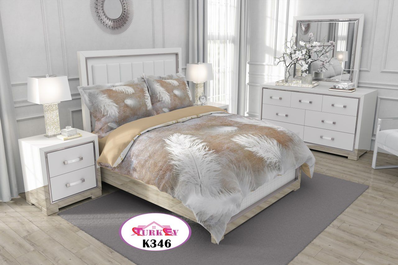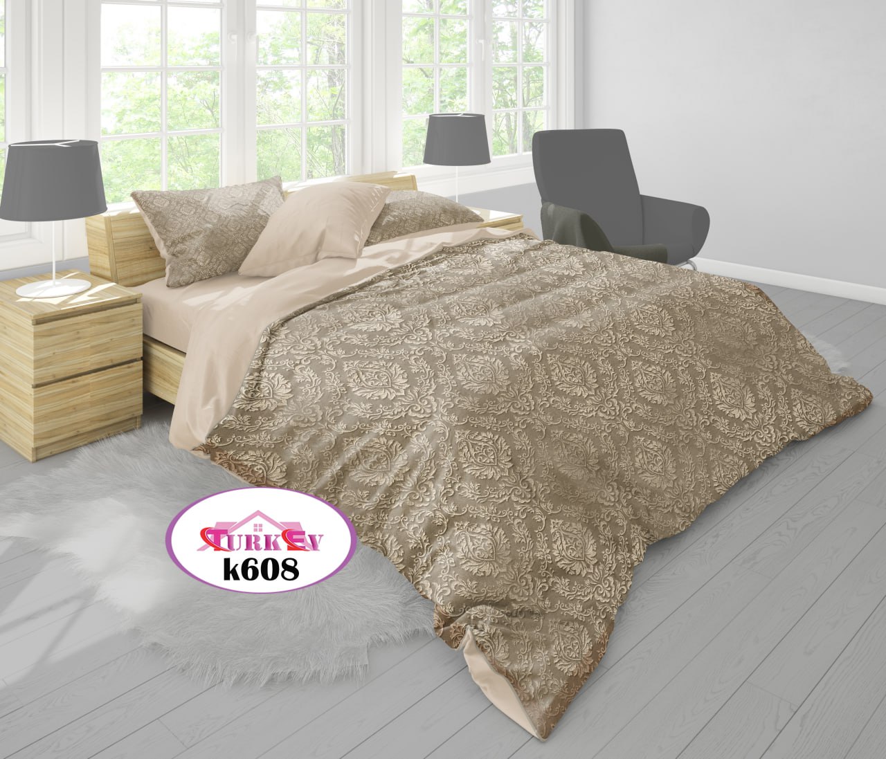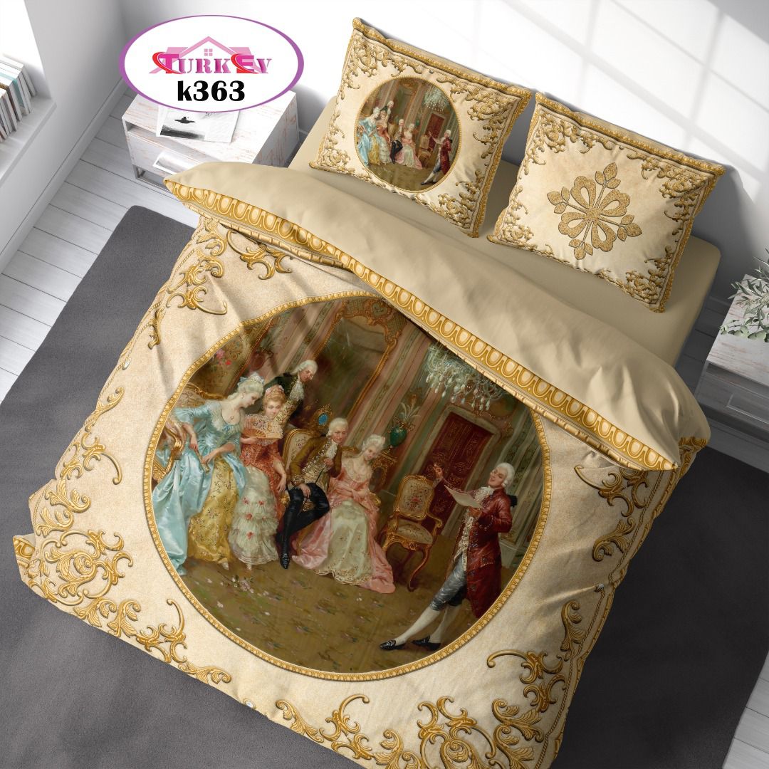 4 تکه شامل: 1 عدد ملحفه تک رنگ، 1 جفت روبالشی پاکتی چاپی، 1 جفت روبالشی پاکتی تک رنگ، لحاف روتختی چرخکاری شده