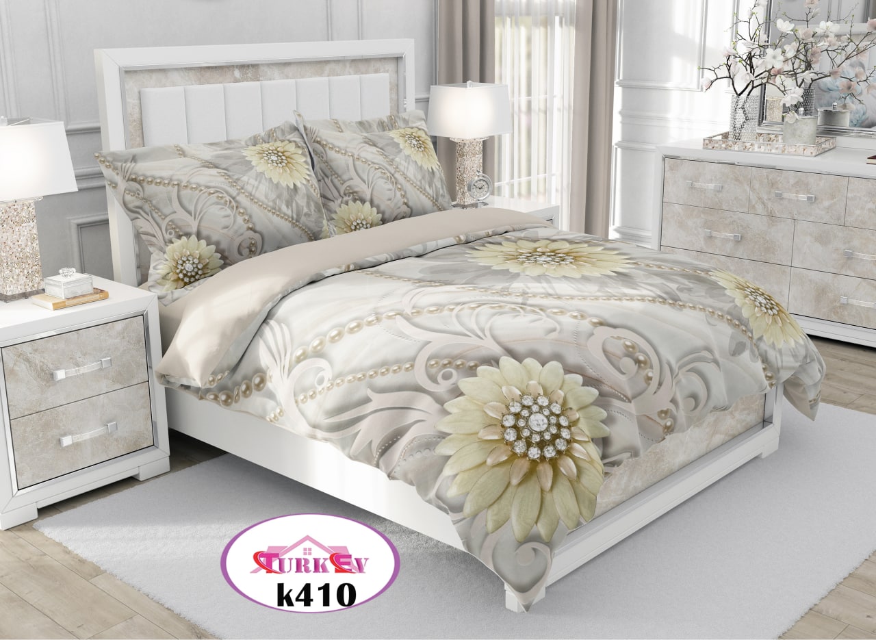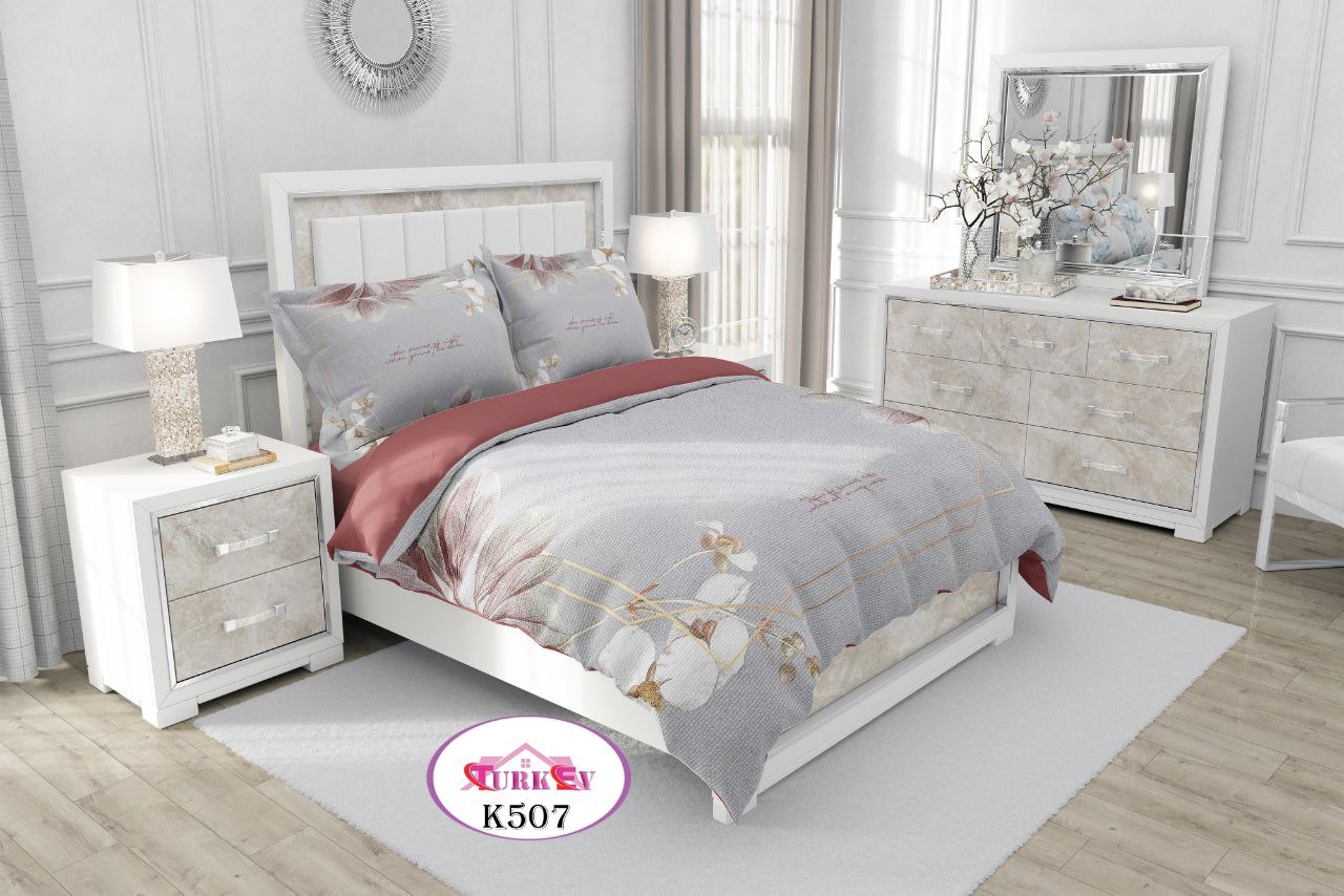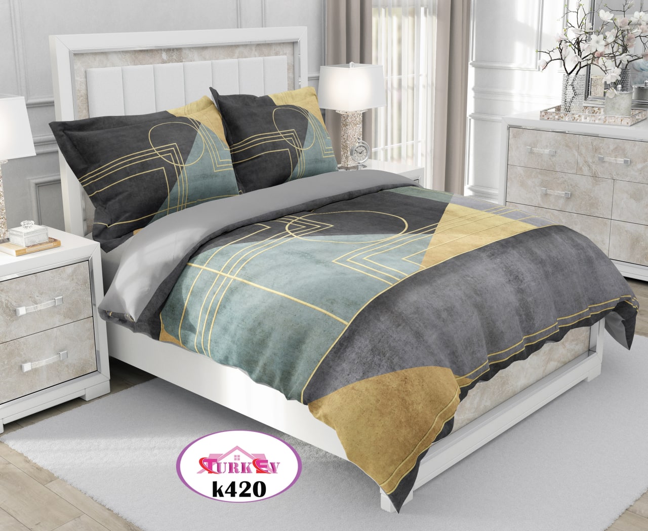4 تکه شامل: 1 عدد ملحفه تک رنگ، 1 جفت روبالشی پاکتی چاپی، 1 جفت روبالشی پاکتی تک رنگ، لحاف روتختی چرخکاری شده