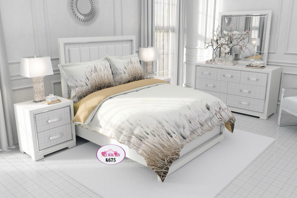4 تکه شامل: 1 عدد ملحفه تک رنگ، 1 جفت روبالشی پاکتی چاپی، 1 جفت روبالشی پاکتی تک رنگ، لحاف روتختی چرخکاری شده